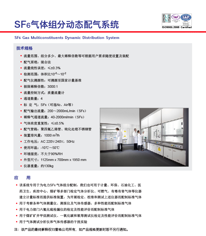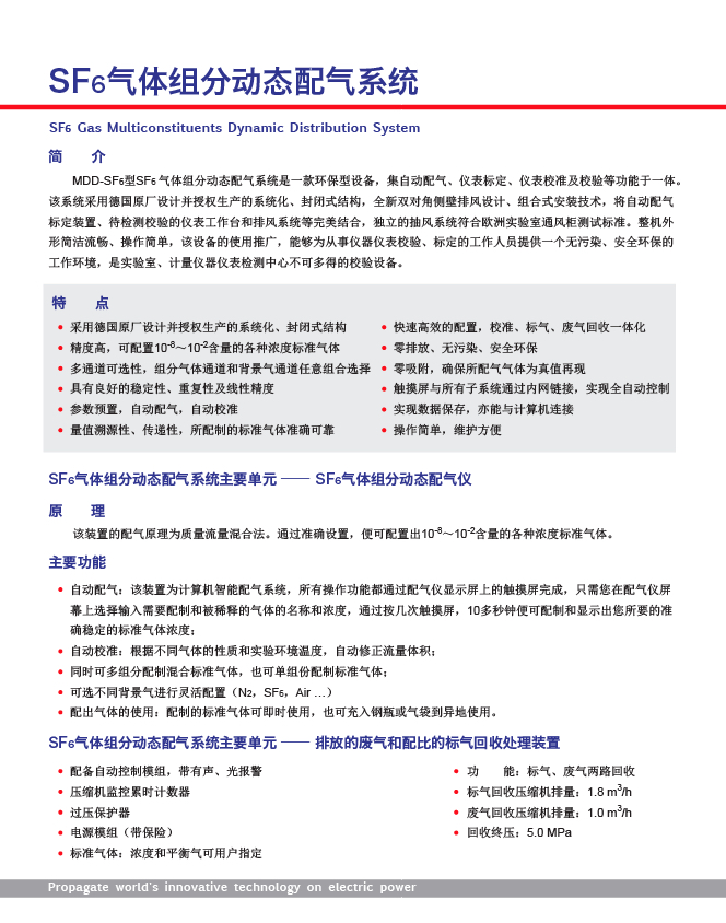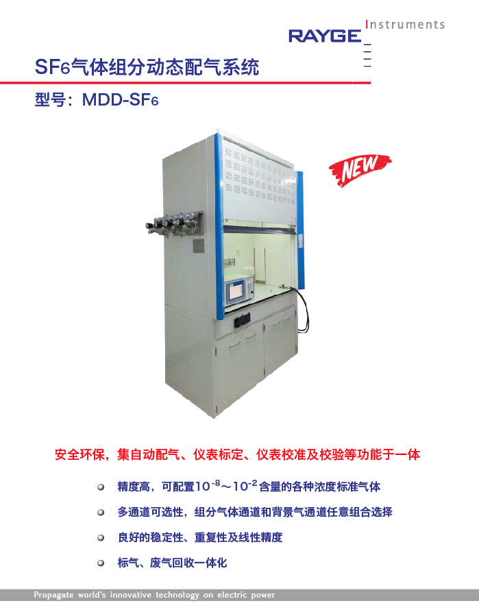 MDD-SF6型SF6 氣體組分動(dòng)態(tài)配氣系統(tǒng)是一款環(huán)保型設(shè)備,集自動(dòng)配氣、儀表標(biāo)定、儀表校準(zhǔn)及校驗(yàn)等功能于一體。該系統(tǒng)采用德國(guó)原廠設(shè)計(jì)并授權(quán)生產(chǎn)的系統(tǒng)化、封閉式結(jié)構(gòu),全新雙對(duì)角側(cè)壁排風(fēng)設(shè)計(jì)、組合式安裝技術(shù),將自動(dòng)配氣標(biāo)定裝置、待檢測(cè)校驗(yàn)的儀表工作臺(tái)和排風(fēng)系統(tǒng)等完美結(jié)合,獨(dú)立的抽風(fēng)系統(tǒng)符合歐洲實(shí)驗(yàn)室通風(fēng)柜測(cè)試標(biāo)準(zhǔn)。整機(jī)外形簡(jiǎn)潔流暢、操作簡(jiǎn)單,該設(shè)備的使用推廣,能夠?yàn)閺氖聝x器儀表校驗(yàn)、標(biāo)定的工作人員提供一個(gè)無(wú)污染、安全環(huán)保的工作環(huán)境,是實(shí)驗(yàn)室、計(jì)量?jī)x器儀表檢測(cè)中心不可多得的校驗(yàn)設(shè)備。
