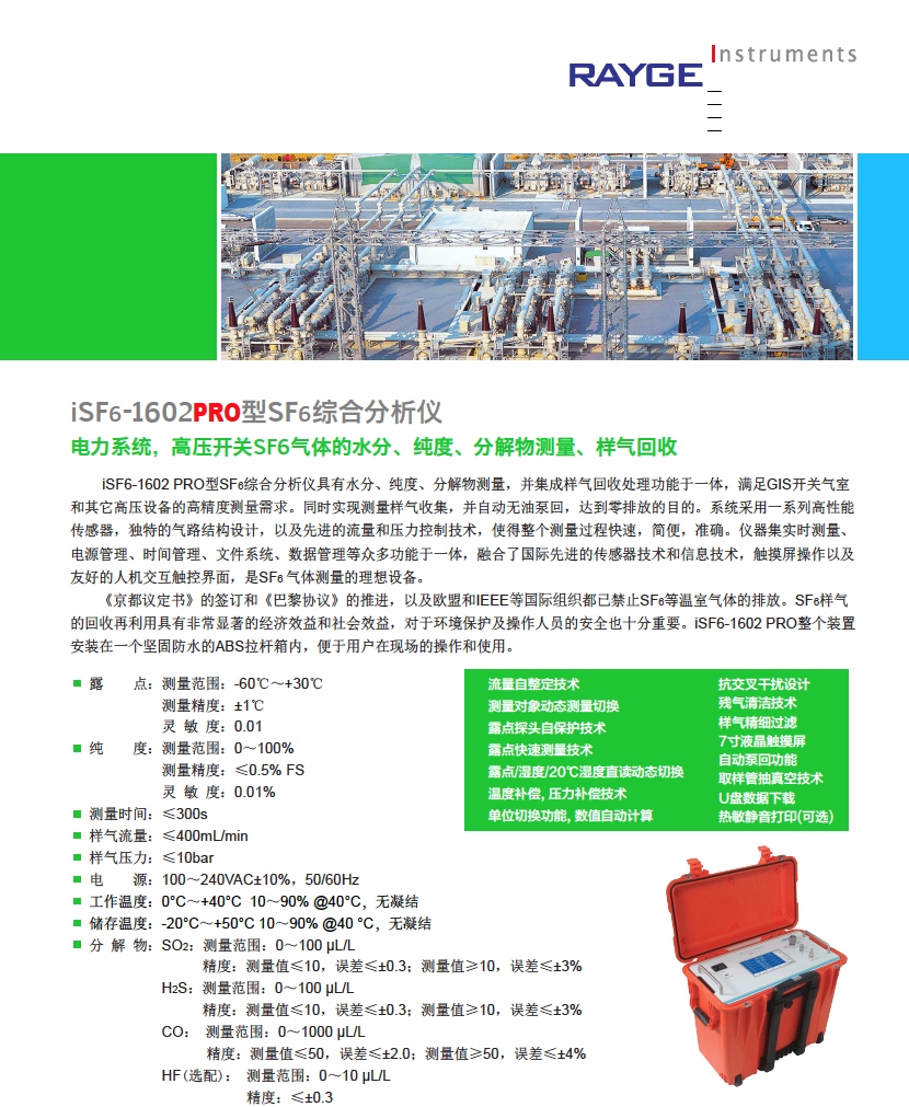 iSF6-1602 PRO型SF6 綜合分析儀具有水分、純度、分解物測量,并集成樣氣回收處理功能于一體,滿足GIS開關(guān)氣室和其它高壓設(shè)備的高精度測量需求。同時實現(xiàn)測量樣氣收集,并自動無油泵回,達到零排放的目的。