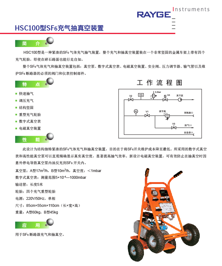 HSC100型是一種緊湊的SF6氣體充氣抽氣裝置,整個充氣和抽真空裝置裝在一個非常堅固的金屬車架上帶有四個充氣輪胎,即使在碎石路面也能行走自如。