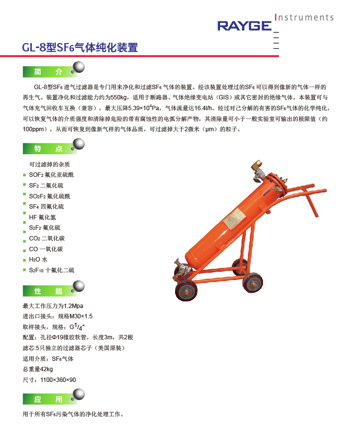 GL-8型SF6 進(jìn)氣過濾器是專門用來凈化和過濾SF6 氣體的裝置。經(jīng)該裝置處理過的SF6 可以得到像新的氣體一樣的再生氣,裝置凈化和過濾能力約為550kg。