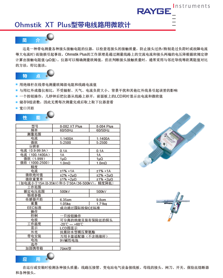 這是一種帶電測(cè)量各種接頭接觸電阻的儀器,以檢查連接頭的接觸質(zhì)量,防止接頭過熱(特別是過負(fù)荷時(shí)或故障電流等大電流時(shí))而燒損引起事故。Ohmstik Plus的工作原理是通過測(cè)量線路上的交流電流和接頭兩端的電壓降根據(jù)歐姆定律計(jì)算出接觸電阻值(μΩ值)。儀器可以精確測(cè)量歐姆值,但在判斷接頭接觸質(zhì)量時(shí),通常采用與鄰近導(dǎo)線等距離阻值對(duì)比的方法,即比值法。