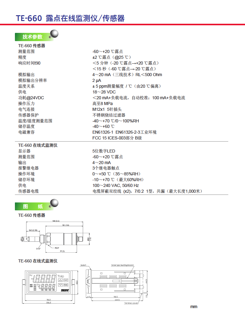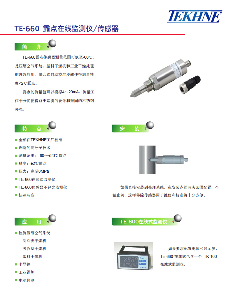TE-660露點傳感器測量范圍可低至-60℃,是壓縮空氣系統(tǒng)、塑料干燥機和工業(yè)干燥處理的理想應用。整合式自動校準步驟使得測量精度<2℃露點。露點的測量值可以模擬4~20mA。測量工作十分簡便得益于緊湊的設計和堅固的不銹鋼外殼。