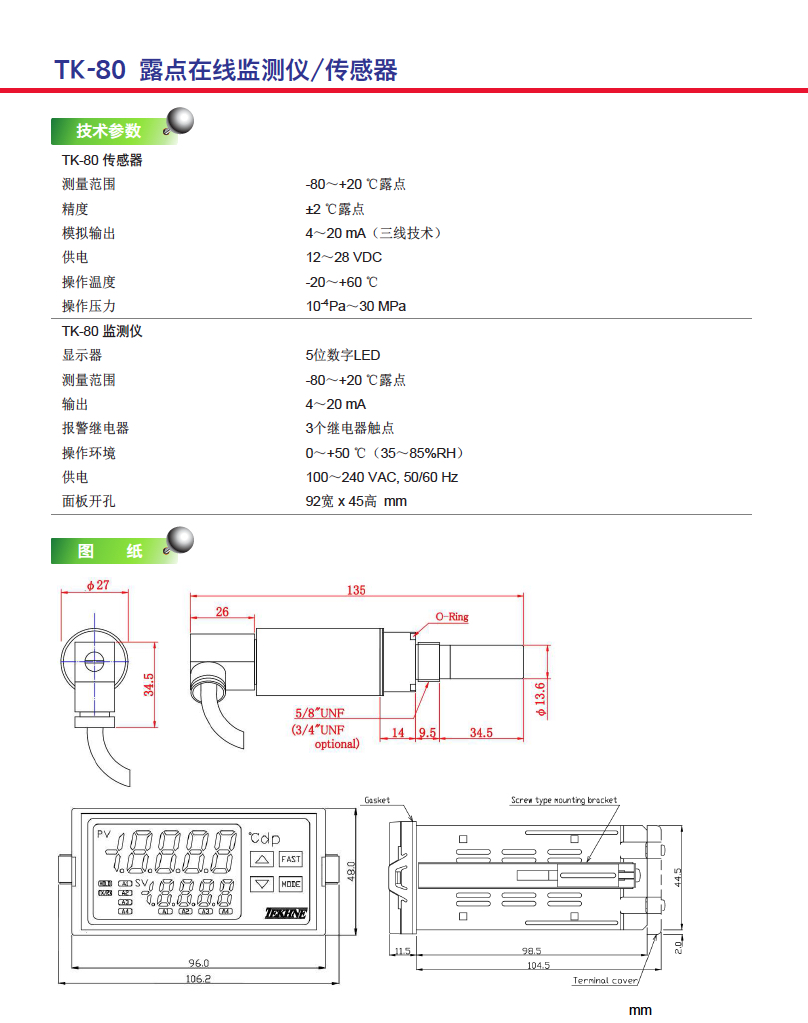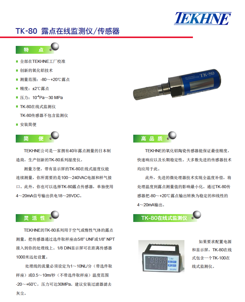 測量方便,帶有顯示屏的TK-80在線式濕度儀能連續(xù)測量,你所需要的是100~240VAC電源和樣氣接口。此外,你也可以選擇TK-80露點傳感器,單獨使用4~20mA信號輸出供電18~28VDC。