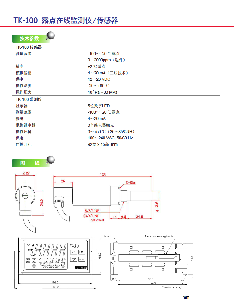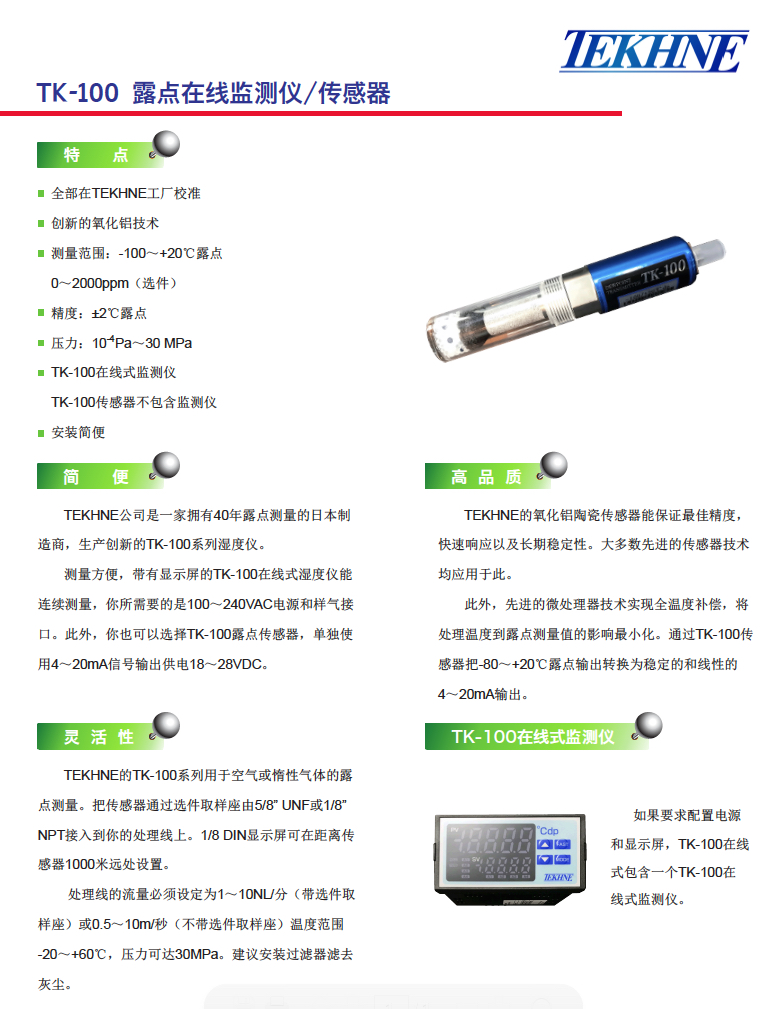 測量方便,帶有顯示屏的TK-100在線式濕度儀能連續(xù)測量,你所需要的是100~240VAC電源和樣氣接口。此外,你也可以選擇TK-100露點傳感器,單獨使用4~20mA信號輸出供電18~28VDC。